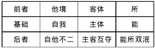 现代新儒家以“心性”作为其基本的立场与取向,意味着其哲学是“主体性”的哲学。“心性”与“主体性”是一体两面。这是因为,“心性”即是主体的心性,是主体、自我的内在呼唤以及对于自身的自觉。在新儒家处,心性之学及其主体性导向,是儒学乃至整个中国哲学的核心精神所在,也是中国哲学区别于西方哲学的特质。唐君毅、牟宗三指出,儒家的心性之学,起源于自我、主体对于客体、所觉的反思,植根于主体对于自身的自觉与能觉,由此形成道德的自觉,并最终趋向于主体所达到的超越能所、主客之对待的绝对形上之境;而儒家心性之学的这三个环节,也是以中间环节即主体对于自身的自觉与能觉为核心义涵的。根据这样的角度和立场,唐、牟竭力揭示出中国哲学的主要特征并非综合精神,而是主体精神。在他们看来,从客体到主体,从所到能,从他境到自我的方向,体现出人的思想和精神不断地走向成熟与自觉。人类思想的成熟与自觉之后所展开出来的取向与角度,可以作为其前与其后的思想的基础。儒家的心性之学及其主体性之维,就是人类思想成熟与自觉的体现。图表表示如下: