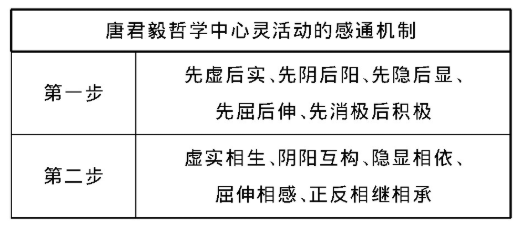 但是,唐君毅似乎并不特别同意牟氏的观点,但学界很少注意到唐君毅的论述。根据唐君毅的感通形上学,认知活动即是“感知”、“知之感通”、“感通之知”的活动。正因为认知是心与境的感通、感知作用,因此认知活动自身并无所执,认知的本性非但不是“法执”,而反倒是“无执”。根据其“心灵九境”的系统,认知活动是心与境的感通机制的直接体现。心境感通的机制是:心灵的感知作用,在其与所知之境相接的第一瞬间,并不是积极地去认知境的内容,而是先消极地隐退自身,由此让所知之境的内容显出。而有了这第一步之后,感知活动的第二瞬间,则是自隐而显,化消极为积极,感而遂通,从而摄受境之内容为知之内容;同时,当心灵感而遂通并有知之后,此心灵复又不执着此知,而自显归隐,以待下一步的认知活动。在唐君毅,知之感通活动如此,道德实践的活动以及形上境界的确立,亦莫不如此。可以说,任何哲学思想,都是心灵、心性的感通机制的体现。而这一感通机制,可以通过“一阴一阳之谓道”(《周易·系辞上》)来概括,知之感通活动就是先阴后阳、其后阴阳互动、一阴一阳的无执之流行过程。而如果在这个过程中心灵有所执,这就意味着认知活动之受阻,而非认知活动之进行。表示如下: