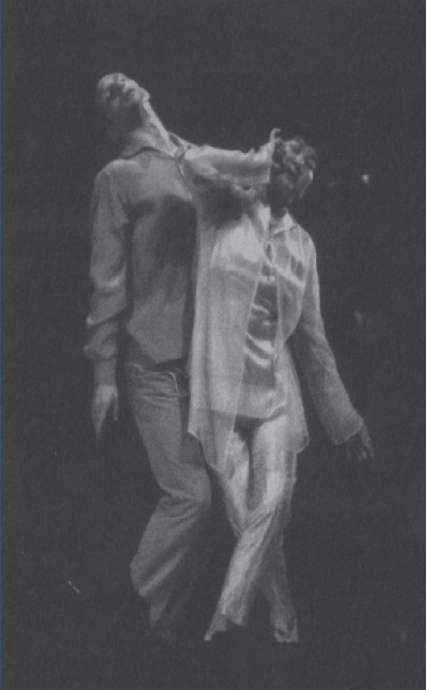 事实上,华文漪的困惑并不仅仅限于对塞勒斯“晦涩不明的舞台意象”,关键是她作为昆曲表演艺术家对表演的非表演性的疑惑。史恺娣认为:“塞勒斯在演员安排上最大的创新是使用了三对主演。第一部分中,劳伦·汤姆(Lauren Tom)与乔尔·德·拉·冯特说英语,华文漪与史洁华用中文唱念。外百老汇演员杰森·马(Jason Ma)是华文漪在维也纳、伦敦和罗马巡演时的搭档。从风格上说,他的表演是最多变的,因为他与乔尔对话时说的是英语,而面对华文漪时则完全使用肢体语言,一句话也不讲。罗马站之后,舞蹈演员迈克尔·舒马赫(Michael Schumacher)替换了杰森·马,他的加入令塞勒斯和华文漪能够更好地为全剧,尤其是第二部分进行舞蹈身段的编排。”但显然这个“最大的创新”是不得已而为之的结果,因为塞勒斯没有找到一位能跟华文漪配得上戏的戏曲小生演员,因此,作为强烈依赖“行动”来完成导演阐释的塞勒斯,他只能很强调华文漪表演中的身段和手势,以与杰森·马、迈克尔· 舒马赫的表演形成对照。这就带来华文漪表演的非表演性的困境:她仍是昆曲的念白,可与之对话的却是话剧式的英语对白,或无声的肢体语言;她仍是昆曲的声腔吟唱,可与之呼应的却是歌剧的歌唱;她仍是昆曲的身段舞姿,可与之交织的却是现代舞蹈的体态。华文漪虽然在表演,但却是在一个非昆曲表演审美规则之外的表演。这个以话剧的英文对白、歌剧的咏叹调、现代舞蹈的节奏环绕着的西方表演形态,挤压着昆曲的表演特性竞相丧失为非表演性、被边缘化。所以,史恺娣说:“不论与舞台剧演员还是舞蹈演员搭档,华文漪高度程式化的表演都与英语世界不受规矩绳墨所限的自然主义表演风格形成鲜明对照。”如果仅仅是“对照”倒也罢了,可问题是昆曲被彻底地边缘化、模糊化了。尤其是第二部分, 史恺娣说:“三对演员悉数登场。其中戏份较重的是歌剧女高音黄英和男高音徐林强的组合,以及一对英语演员组合;华文漪与迈克尔·舒马赫则在舞台的边缘和后方徘徊,偶尔以昆曲程式化身段手势和现代舞相结合的形式进行舞蹈表演。”(见图1)