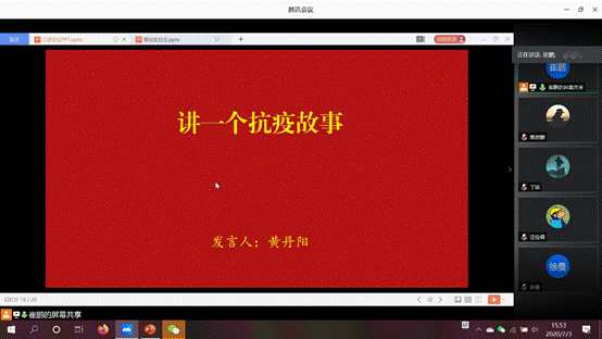 专题组织生活会的最后,黄丹阳同志为支部党员讲述了自己的抗疫志愿故事。在疫情防控工作期间,黄丹阳作为武汉大学青年志愿者,加入了武汉大学“与逆行者同行-为奉献者奉献”志愿服务团队,为武汉一线医务人员子女提供线上一对一义务教学辅导,希望能减轻医务人员的后顾之忧。黄丹阳认为,同舟共济,每一份关怀能融汇为守望相助的温暖;众志成城,每一份力量会铸就成砥砺前行的勇气。从寒冬到盛夏,每一个武大青年志愿者都是不忘初心、勇敢奋进的新时代青年。她以习近平总书记对青年的寄语与大家共勉:“青年一代有理想、有本领、有担当,国家就有前途,民族就有希望。”