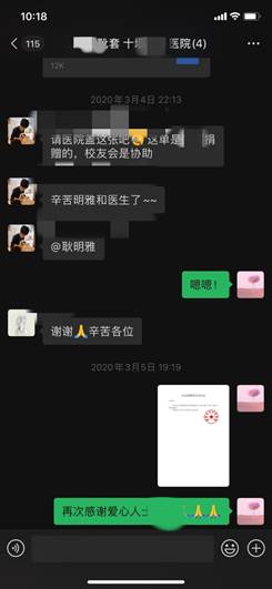 耿明雅同学参加了2月下旬至3月下旬的由武汉大学北京校友会发起的抗击新冠肺炎支援湖北的志愿活动,负责十堰市国药东风总医院、东风花果医院、郧阳区人民医院、郧西县六郎乡卫生院等四家医院的抗疫救援物资统筹,高效完成校友会、医院、捐赠方、物流等的合作与沟通,努力加快物资募捐与送达的速度。统筹之余,为医院联络人传递了正能量,鼓舞了抗疫人员的士气。
