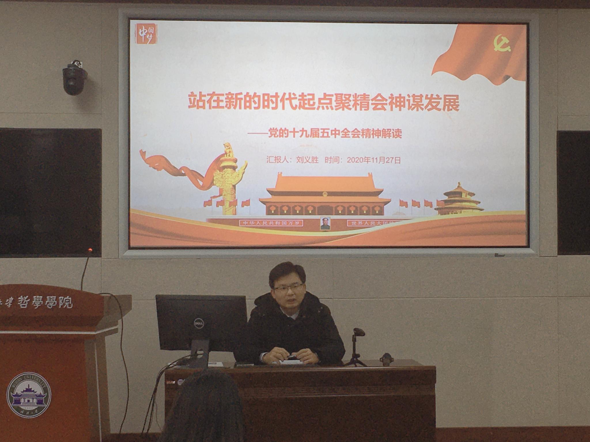 刘义胜副书记主讲了以“站在新的时代起点聚精会神谋发展——党的十九届五中全会精神解读”为主题的党课。他为大家详细介绍了党的十九届五中全会的召开背景、主要成果、起草情况和特色亮点,并围绕《中共中央关于制定国民经济和社会发展第十四个五年规划和二〇三五年远景目标的建议》(以下简称“建议”)进行了解读。刘义胜指出,《建议》明确了未来5年经济社会发展的指导思想、基本原则、目标要求、主要任务和重大举措,描绘了到2035年基本实现社会主义现代化的远景目标,令人鼓舞,催人奋进。他强调,研究生党员要把自己未来5年乃至15年的规划目标与国家的规划目标紧紧联系在一起,德业并进,志存高远,为推动国家高质量发展,早日建成社会主义现代化强国贡献青春力量。