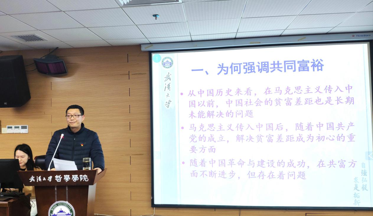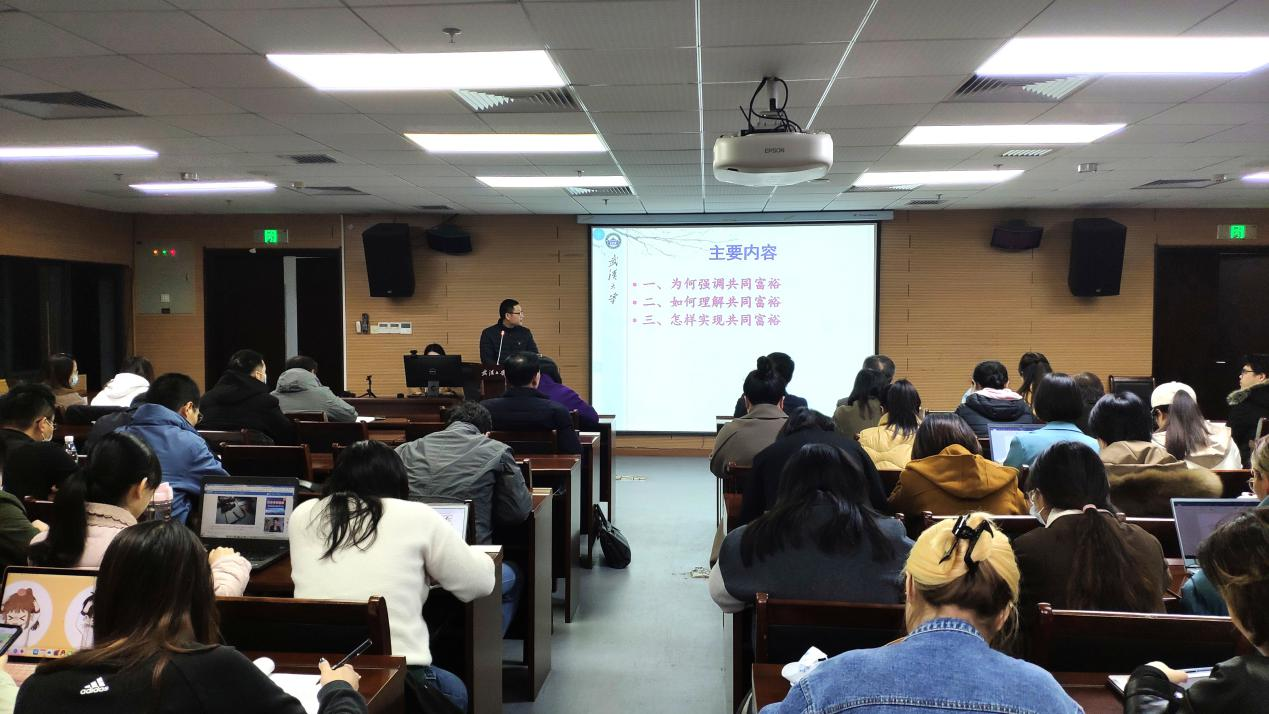 (通讯员翁路)为深入学习贯彻十九届六中全会精神,海角社区 于2021年12月23日下午在学院B107开展“师生共上一堂课”支部主题党日活动。马克思主义哲学教研室主任赵士发教授和马克思主义哲学专业博士生张昊同志共同作了题为“走向共同富裕——学习十九届六中全会精神”的主题报告。行政党支部、马哲教工党支部、马哲博士生党支部、马哲硕士生党支部以及本科生党支部参加此次主题党日活动。主题党日活动由李志副院长主持。武汉大学校党委第七轮巡视第三巡视组旁听此次主题党日活动的讲座。