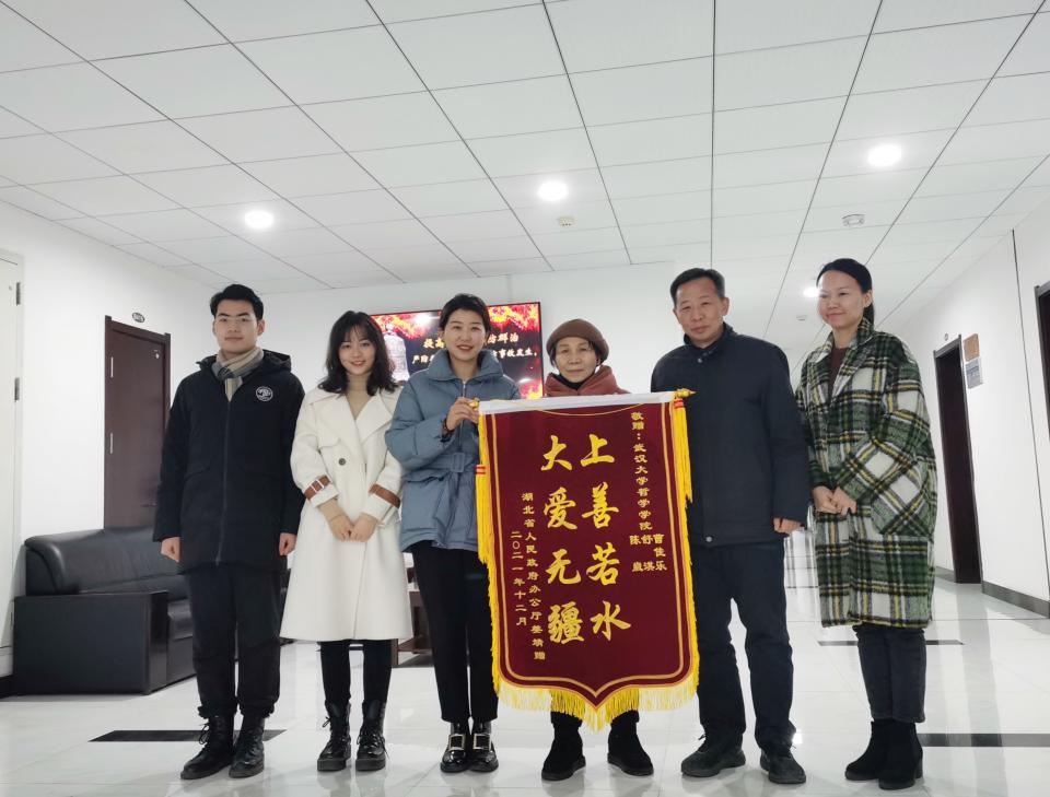 (通讯员:杜金玉)“感谢学院提供这么好的平台,培养了三位优秀的学生,我们一家人都深受感动!”2022年1月5日上午,湖北省人民政府办公厅退休职工姜靖将印有“上善若水 大爱无疆”的锦旗送到了海角社区-原创视频免费看 学生工作办公室,真诚感谢海角社区 领导对“哲里有爱”志愿者团队工作的支持,感谢团队中三名志愿者曹佳乐、舒淇和陈崴的倾情相助。海角社区 党委书记卢昌宁、党委副书记严璨、学工办主任张辉参与接待。